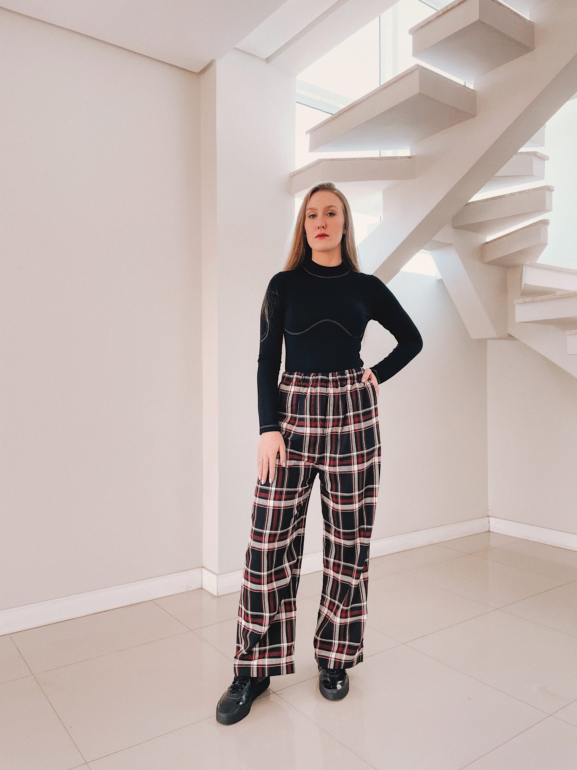 Calça em tecido flanela xadrez levemente peluciado por dentro, com modelagem mais ampla para um caimento mais leve e confortável e elástico na cintura para melhor ajuste ao corpo, possui dois bolsos laterais (verificar tabela de medidas abaixo).