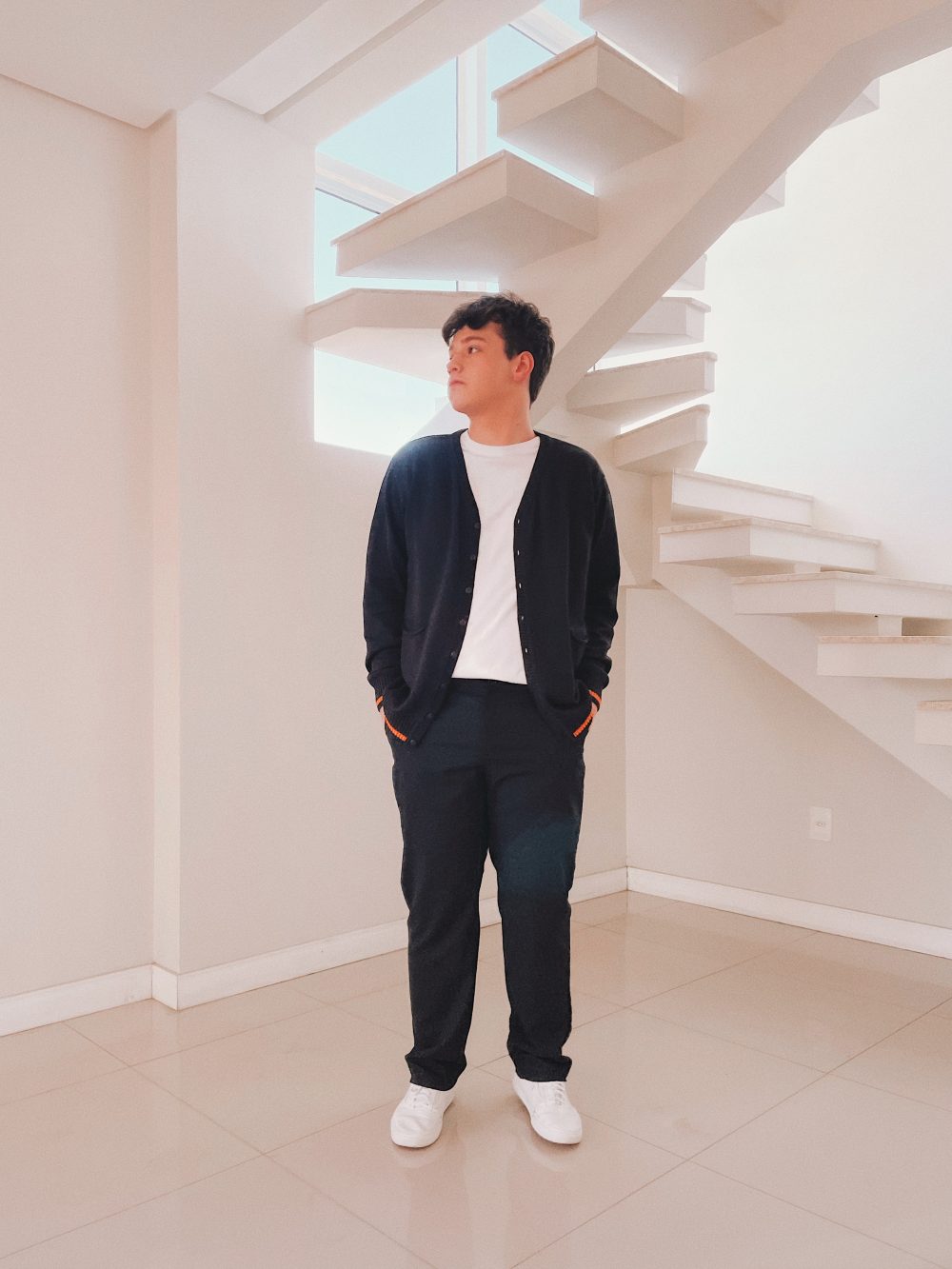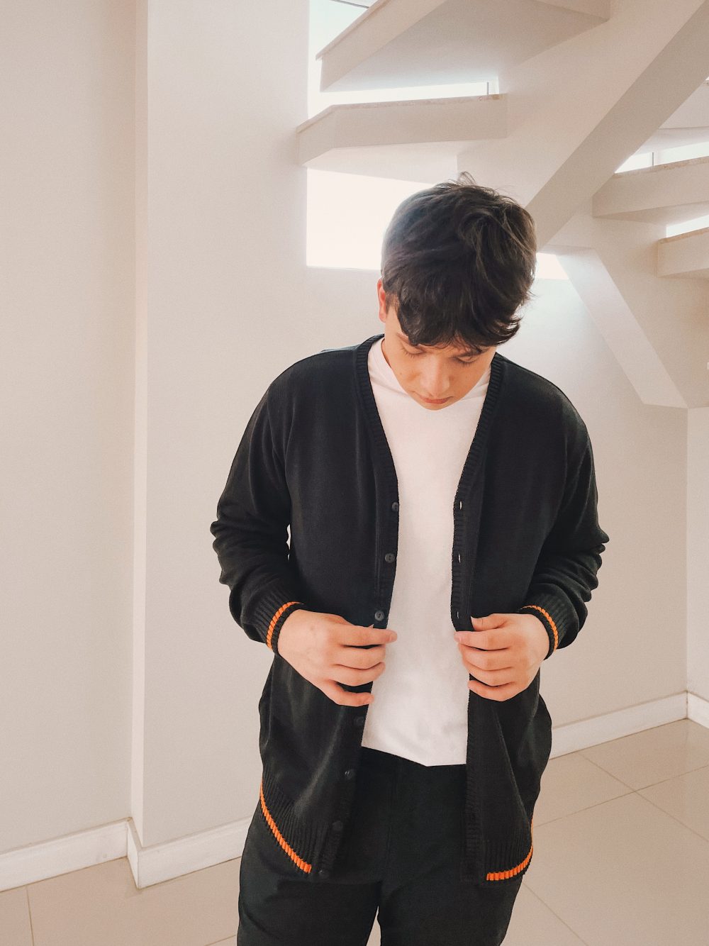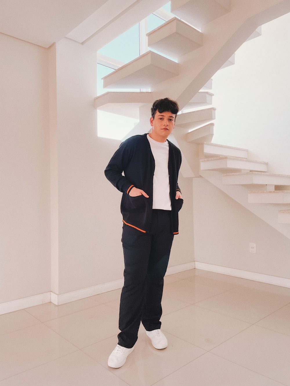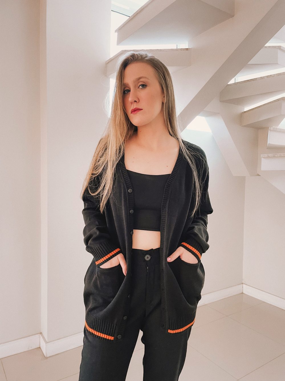 Cardigan manga longa liso com detalhe de listra em cor contrastante no canelado dos punhos e da barra, abertura por botões e dois bolsos frontais (verificar tabela de medidas abaixo).