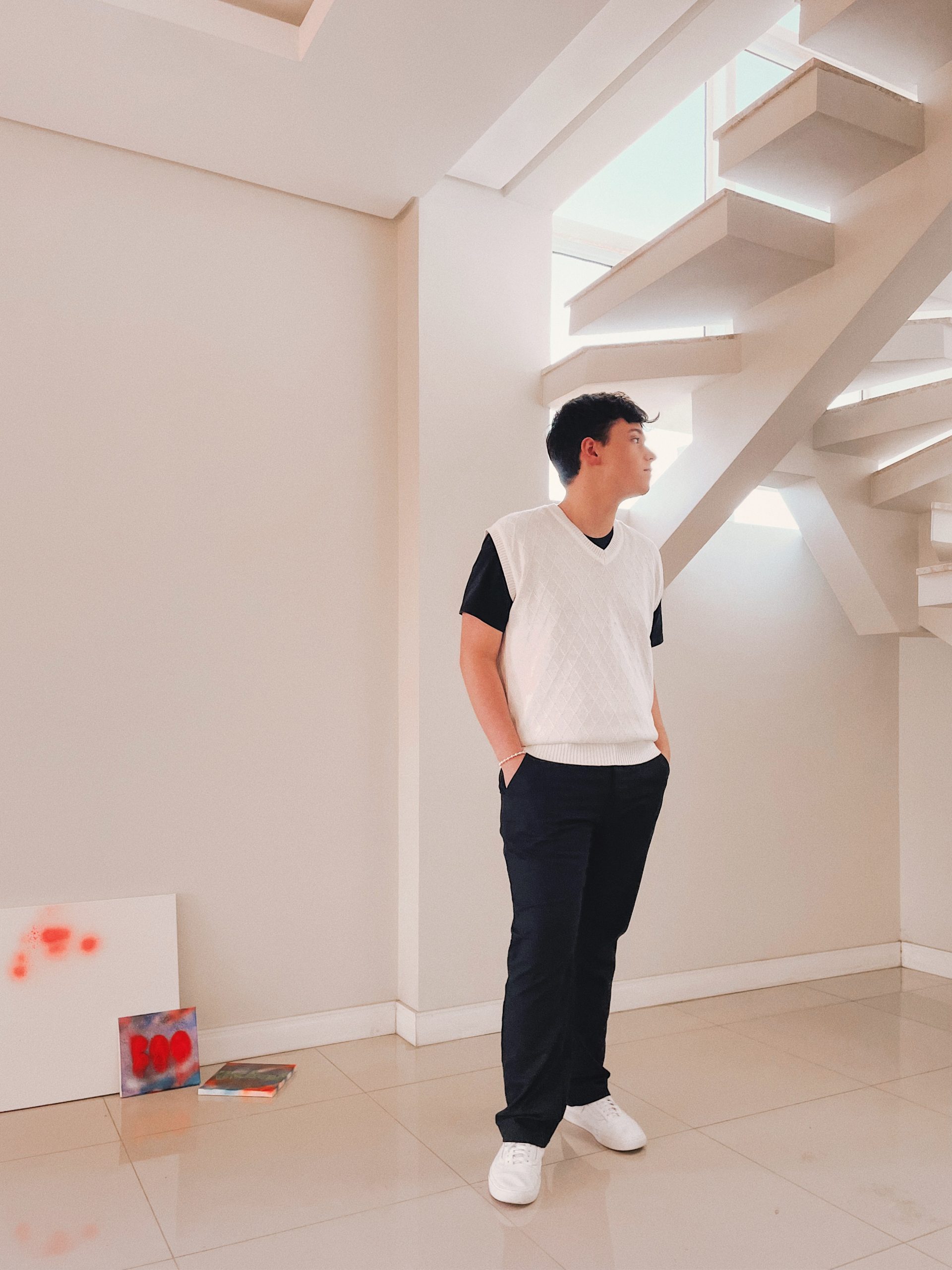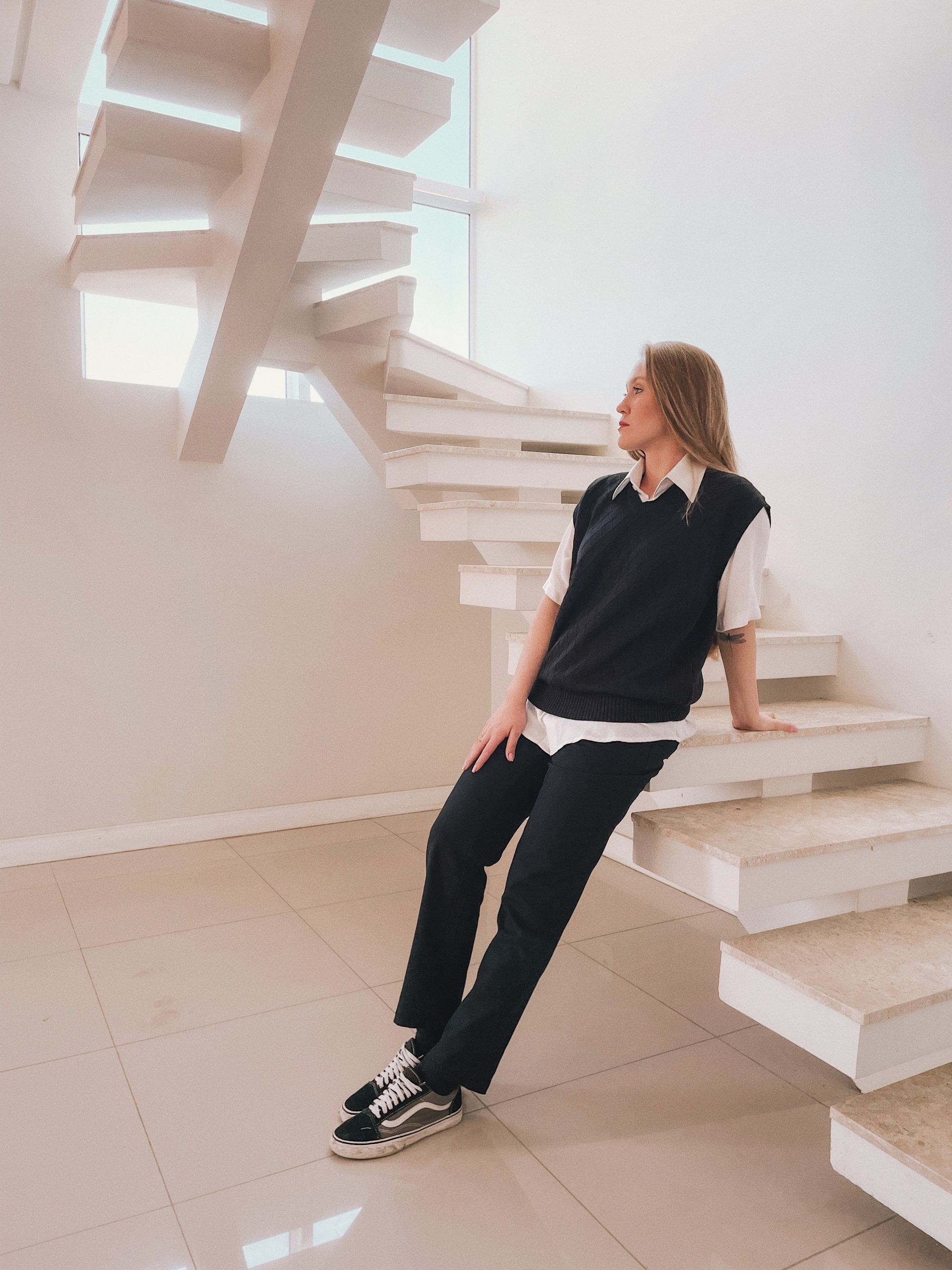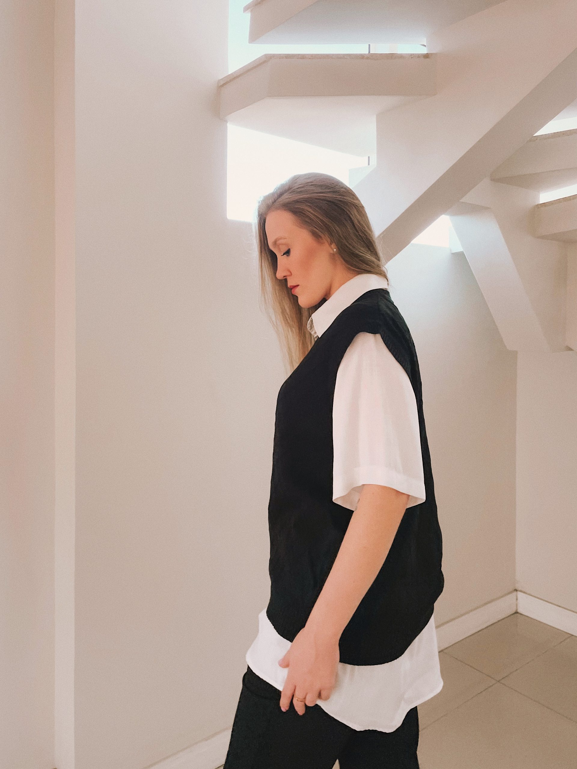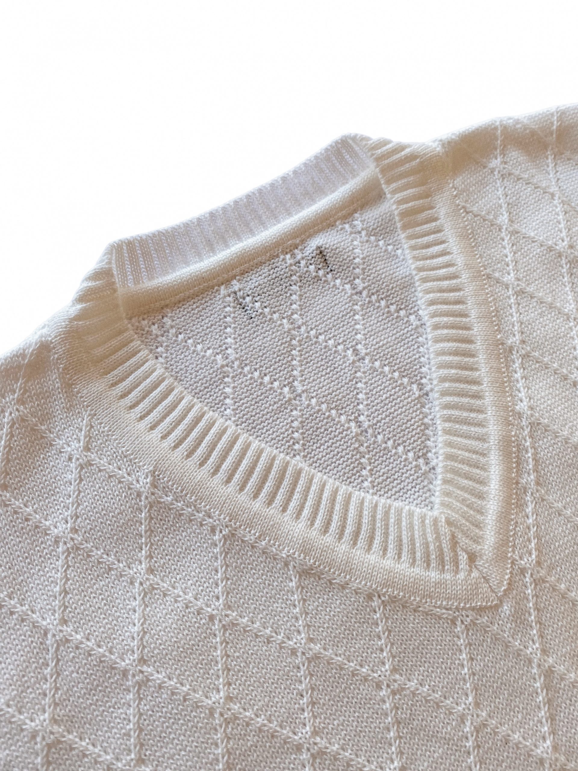 Colete decote V em tricô inteiramente feito com um trabalhado discreto mas que faz toda diferença, peça clássica com modelagem ‘true to size’ (verifique tabela de medidas abaixo).